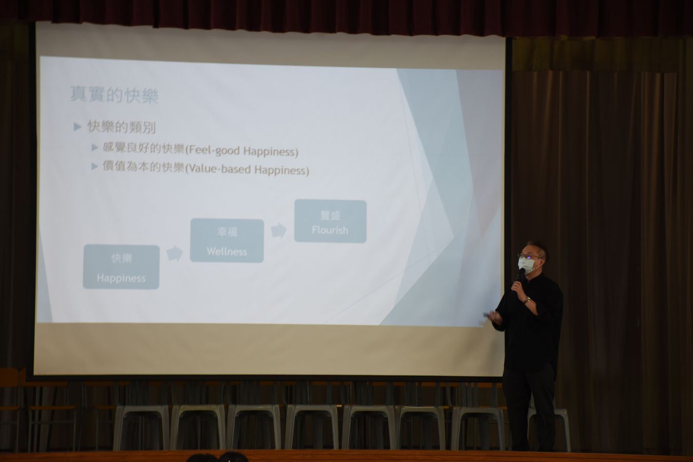 郭先生在演說中教導同學如何「安頓」負面情緒並在生活中找到快樂,進而邁向幸福,即願意付出,甚至有限度的「犧牲」來達成有意義及滿足感的生活。郭先生鼓勵同學欣賞並發揮自己的性格強項,提升抗逆力,並活得更有方向感及動力,從而令生命更豐盛。郭先生演示的主題深入淺出,令本校師生上了寶貴的一課。