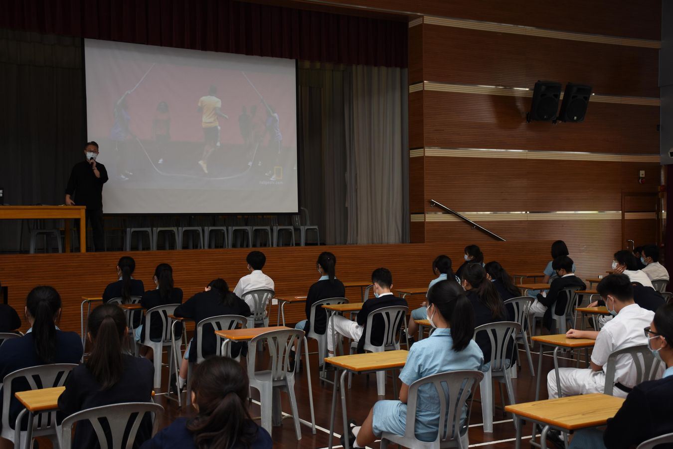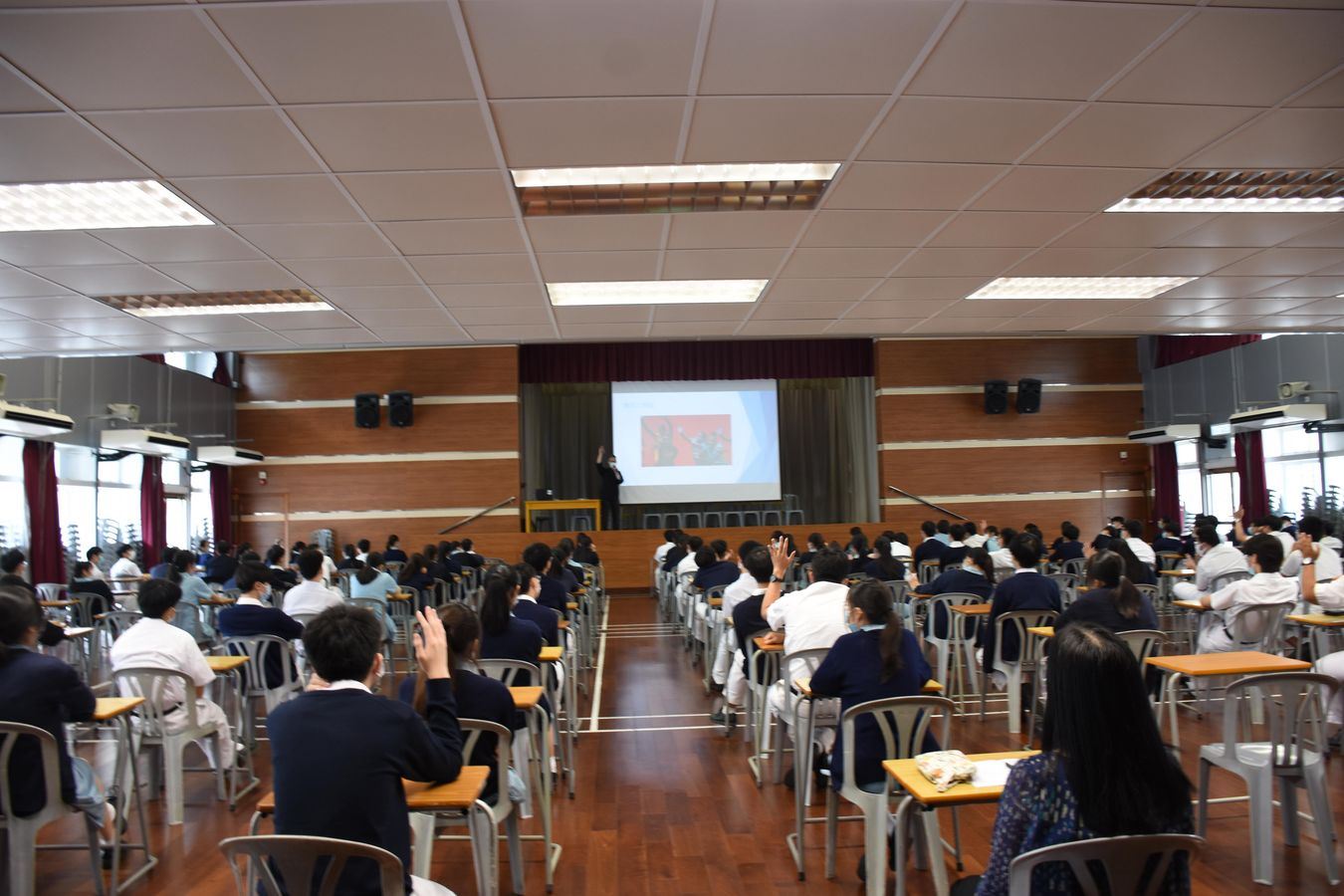 由於新冠肺炎疫情的關係,郭先生預先錄製了有關視頻並分別在線上(中一級同學)及課室(中二至中四級同學)播放。同時,郭先生也在禮堂為中五級同學即席演講。