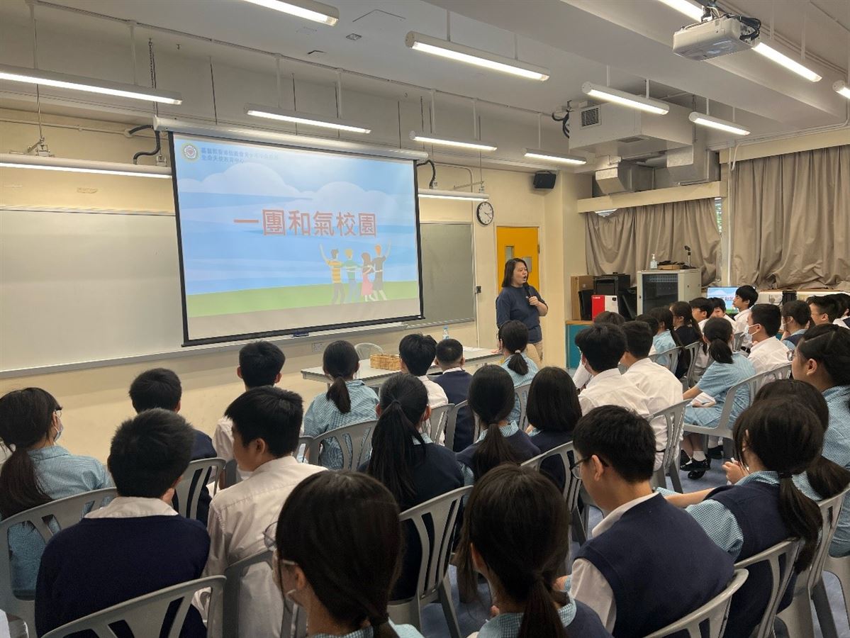 為配合本年度學校的關注事項一,增強同學們的抗逆能力,輔導組於11月6日(星期三)邀請《基督教香港信義會青少年中央服務中心》的註冊社工王姑娘為全級中一同學舉辦名為「一團和氣校園」的專題講座。透過認識校園欺凌的定義和影響,希望讓中一級的同學學習如何面對及處理欺凌的事件,更重要的是明白共建和諧校園的重要性,一同於新的學習環境之中,發揮互助戶愛的精神,建立正確的價值觀。